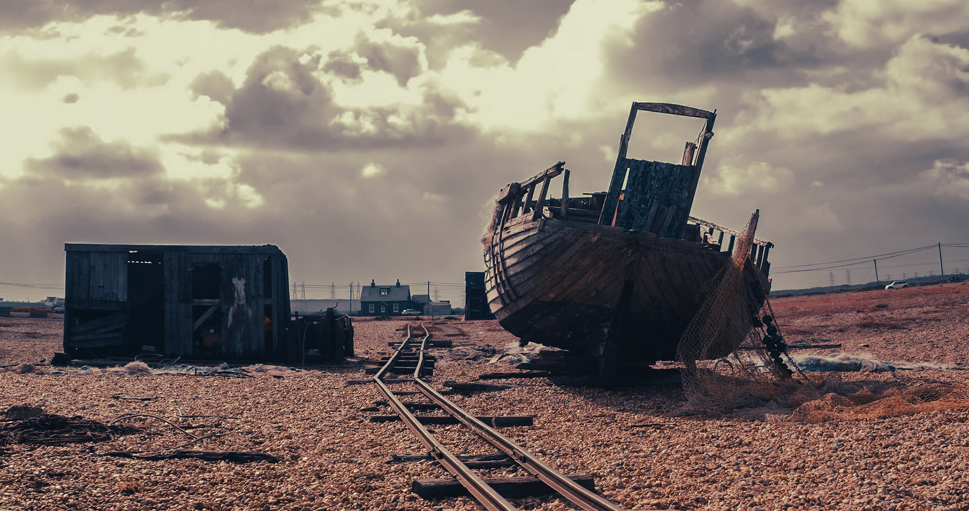 Old fishing hut on the beach at Dungeness with old unused railway lines runng down the side