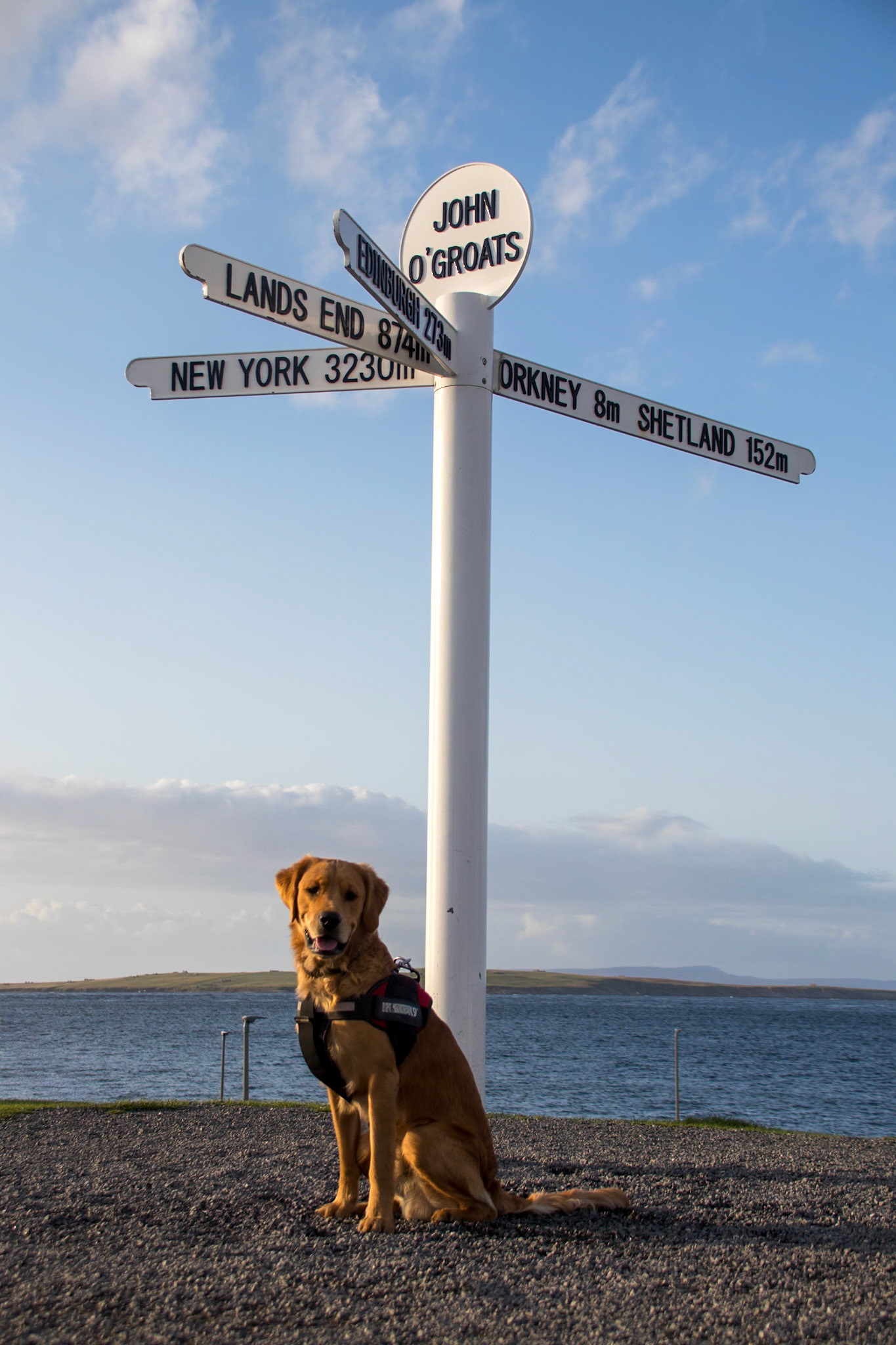 Sign post at John O'Groats with fishing boats in the background